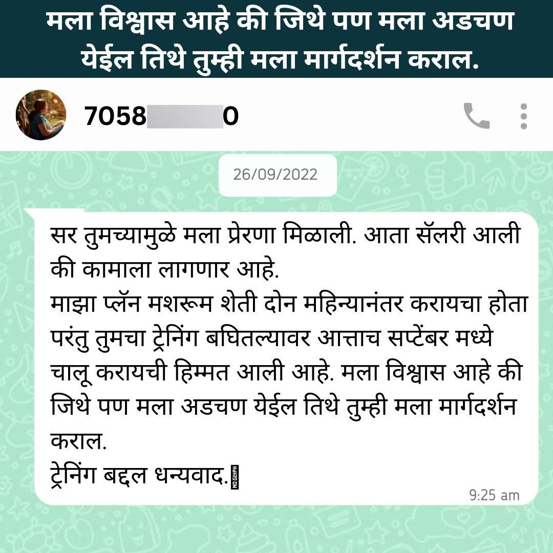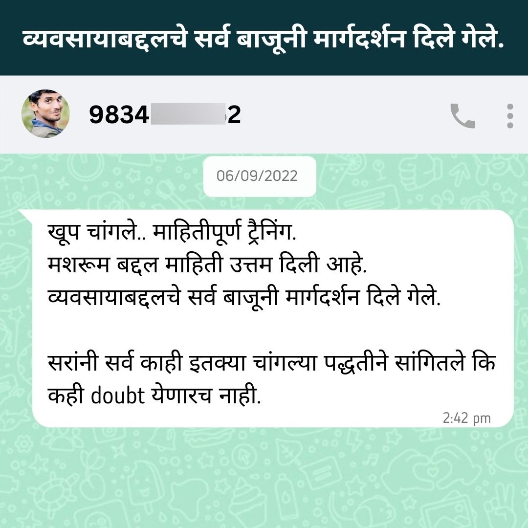 • अचूक मिळालेल्या मार्गदर्शनामुळे मशरूम शेती सुरु करण्याचा आत्मविश्वास व दूरदृष्टी मिळते.
