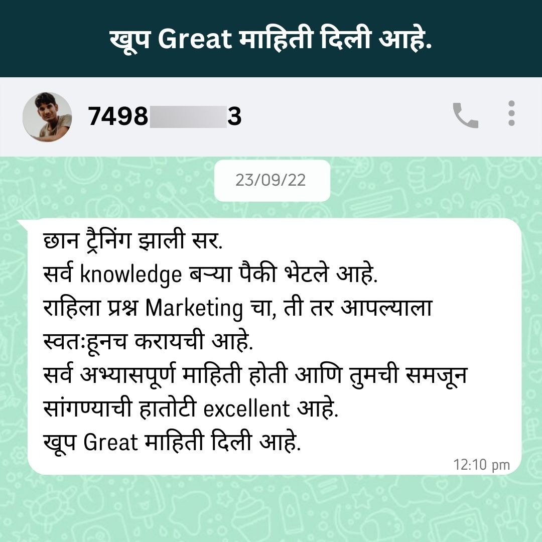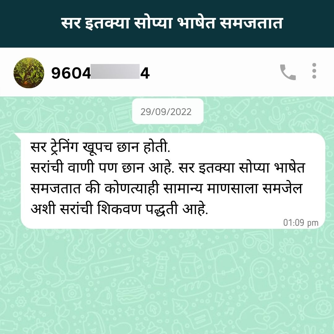 छान प्रश्न, प्रशिक्षण मिश्रित आहे. तुम्हाला 4 तासांपेक्षा जास्त रेकॉर्ड केलेले व्हिडिओ मिळतील जे तुम्ही तुमच्या सोयीनुसार दिवसातून कधीही पाहू शकता. आणि एक लाईव्ह सेशन (Live Session) असेल, जिथे तुम्ही तुमचे प्रश्न सरांना विचारू शकता.